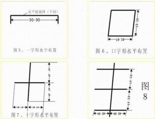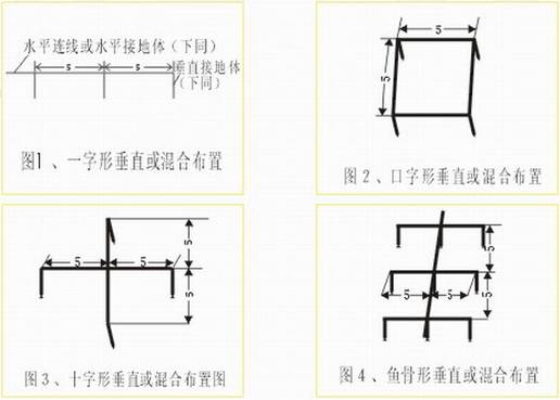 如图1-4,分一字形、十字形及鱼骨形。特别要指出的每根垂直接地体之间的距离不应小于5米,否则有屏蔽作用,降低降阻效果,此方法仅在垂直接地体周围按下图(垂直接地体的埋设)施用降电阻剂,此法适用于地形狭窄,但能深挖或有条件使用机械钻孔的情况。
