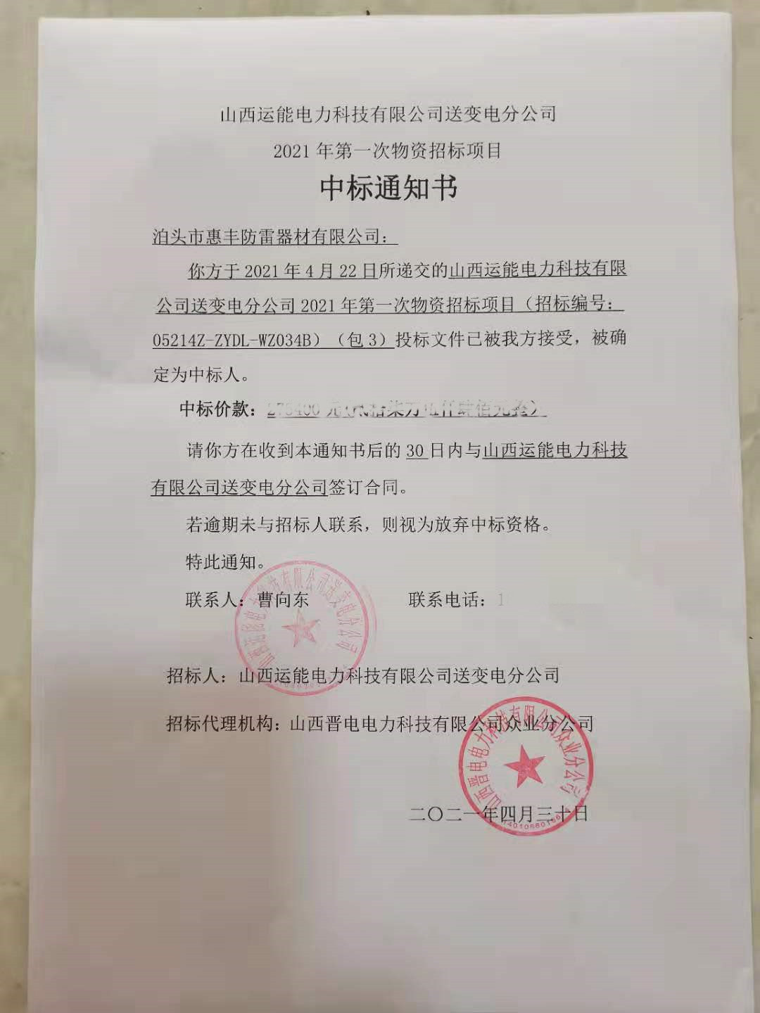 运城垣曲县松树岭110KV输电变电工程王茅-松树岭110kv线路工程乙供材物资采购。标号:05214-zydl-wz034b惠丰公司中标。此次采购的接地材料包括40*5石墨接地体,40*6*3000铠装引下线,水平连接件,16*55的螺栓。中标通知书如下: