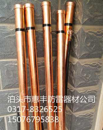 惠丰电解离子接地极属于铜制品,铜管,铜帽,铜线,铜焊头。紫铜有顽强的能力,例如在地下古墓里挖出来的铜器,经过上千年的腐蚀氧化依然保留下来。选用铜材做接地材料不但而且导电快,能把闪电瞬间流向土地。、导电快、这是紫铜离子接地极的两大法宝。